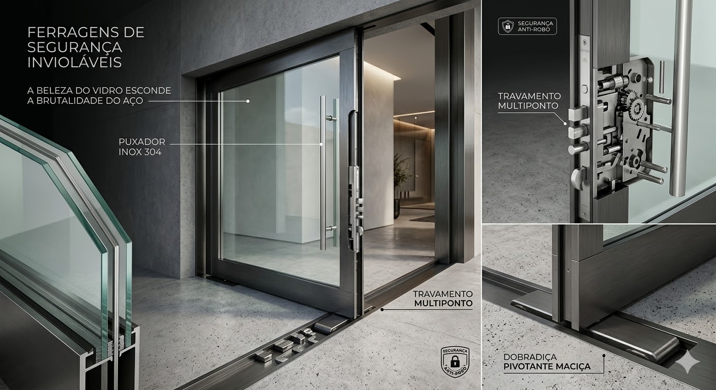 A beleza do vidro esconde a brutalidade do aço. Equipamos as nossas linhas pesadas com fechos tipo concha com travamento multiponto, puxadores em inox 304 e dobradiças maciças para portas *pivotantes* colossais. A estética não sacrifica a segurança antirobo.